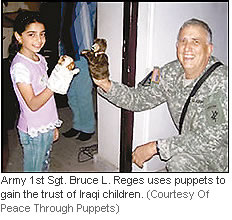 The reaction was immediate when Army 1st Sgt. Bruce L. Reges strode into the classroom in the Baghdad suburb of Baqubah, in the volatile Diyala province. ![]() At 6-foot-5 and wearing full body armor, Reges, 57, looked fearsome to the schoolchildren. Outside, two Stryker armored vehicles blocked the street. A heavily armed security detail was checking out the roof and other classrooms. Reges is assigned to an Army civil affairs unit out of Fort Bragg, N.C., working to reconstruct and support schools, irrigation projects and honey farms in Diyala. The team was visiting the school to assess what could be done to help, but the young students were terrified. "Two of the girls started to cry and escape somehow, and the teacher had to calm them down and tell them that we were there to help them, not to hurt them," Reges recalled. "It was emotionally tough for me to see a child so traumatized by U.S. soldiers that they reacted that way." That night in May, Reges sent an e-mail to his mother, Jean Reges Burn, at her home in Reston: Could she send him two small puppets that he could carry in the cargo pockets of his uniform? "I thought, we need some way to let them know we are human, too -- fathers, brothers, sisters, mothers," Reges said. "So I thought two small puppets in my cargo pocket would be helpful in bridging the gap." Burn quickly shipped a package of puppets to Iraq, including several German Steiff hand puppets she had in the house. "He's a big man, and when he has his armor on, he needs something to soften that appearance," Burn said. The puppets had the desired effect on the children. Reges soon sent another e-mail to his mother. "He wrote back and said, 'Mom, I need as many puppets as you can send, as quickly as possible,' " Burn said. Thus was born Peace Through Puppets, a nonprofit organization operated by Burn and her friends that is dedicated to helping U.S. soldiers stationed in Iraq communicate with children affected by the war by keeping them supplied with hand puppets. Jean Burn, who is 80, was uniquely qualified to act on her son's request. "Long ago and far away, I was once a professional puppeteer," she said. In Colorado, she made marionettes and performed in a variety show. After moving to the Washington area, she was a specialist in learning disabilities for 20 years with Fairfax County public high schools. She obtained grants to support her efforts to incorporate puppets into the curriculum. These days she is still a puppetmaker but has given up performing. Bruce, her eldest son, "grew up with that, and I trained him," Burn said. Reges, a Michigan resident, is a retired teacher who has been in the Army Reserve for 20 years. Called up in the fall, he deployed to Iraq in January, leaving behind his 25-year-old wife, Christy. His mother's training has been put to good use in Iraq, where he pulls out a small puppet at almost any opportunity with a child. "The reaction is immediate," Reges wrote in a recent e-mail. "The child reaches out, and I look at the mom and raise my eyebrows -- like, is it okay? I have never had a parent say no. Every child I have given a puppet to knows exactly what to do with them. "They put them on and disappear behind Mom's skirt. I gave one to a little guy . . . and his mom and an aunt smiled so much -- it really meant a lot to me." Reges has received support from his command and fellow soldiers, although "not all of them get it," he said via e-mail. One colonel "dressed down" a lieutenant colonel when he spotted the subordinate using a finger puppet to play with a child, Reges said. A few days later, the lieutenant colonel was involved in a house search. "He told me he wished he had some puppets because the four kids in the house were terrified when our guys went through," Reges recalled. "I gave him a set of new ones, and he stuck them in his cargo pocket. He wasn't going to get caught short again." Likewise, Reges said, one of the sergeants in his civil affairs team was skeptical but agreed to try the puppets, giving them to some children he encountered. "He came back with this incredible look on his face," Reges said. "When it works, it's like magic." The puppets have become quite popular in Reges's unit. He estimates he has given away about 200, including some for a Special Forces unit heading out on long patrols to remote villages. "I told them to let the medics give them out when they treat kids," he said. "The puppets never come back." Reges sees another important benefit from the puppets. "If we are seen as real human beings, it is harder to kill us," he said. "I had heard rumors of kids cutting command wires to IEDs on the way to school," to keep the improvised explosive devices from hurting Americans. "Even if it's not true, I would like to believe it was. So the pocket puppets idea was born." Burn, working from her home, has embraced the project. "You know how mothers are," she said. She ran out of her supply of Steiff and homemade puppets and has started ordering them from China. She is getting organizational help from relatives and friends living in Northern Virginia and Maryland, including fellow puppeteers Bob and Judy Brown of Oakton. Burn said: "It's not going to heal the wounds of that war, but it's contributing a little comfort and compassion." For information about the project, go to http://www.peacethroughpuppets.com. Military Matters is published twice each month in the Extras. Steve Vogel may be reached at vogels@washpost.com |